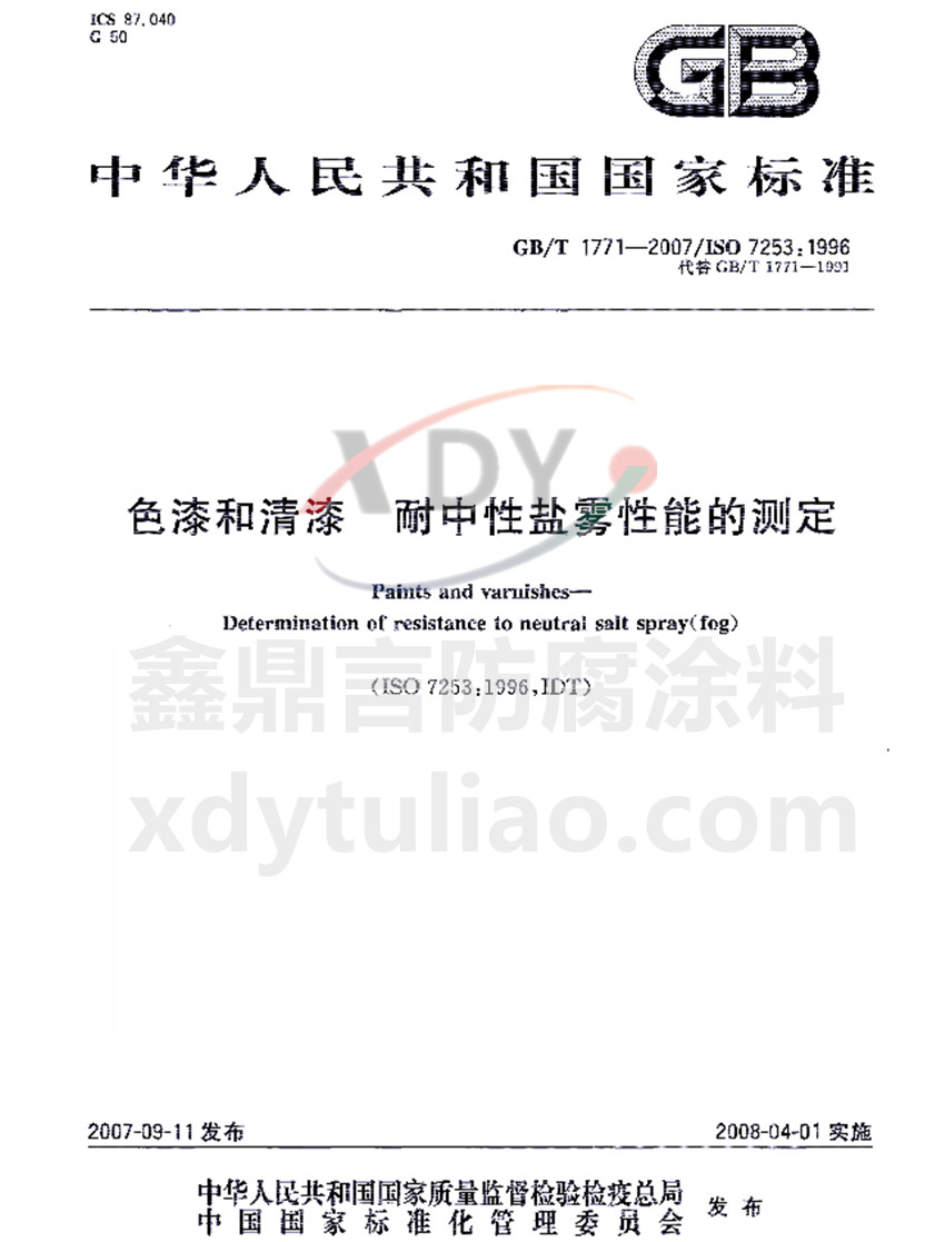 GB/T1771-2007色漆和清漆 耐中性鹽霧性能的測(cè)定標(biāo)準(zhǔn)是照搬GB/T1771-2007《色漆和清漆 耐中性鹽霧性能的測(cè)定​》紙質(zhì)版內(nèi)容。大家可以放心參考。 ICS 87.040 G50 GB 中華人民共和國(guó)國(guó)家標(biāo)準(zhǔn) GB/T1771-2007/ISO 7253:1996代替GB/T1771-1991 色漆和清漆 耐中性鹽霧性能的測(cè)定Paints and var