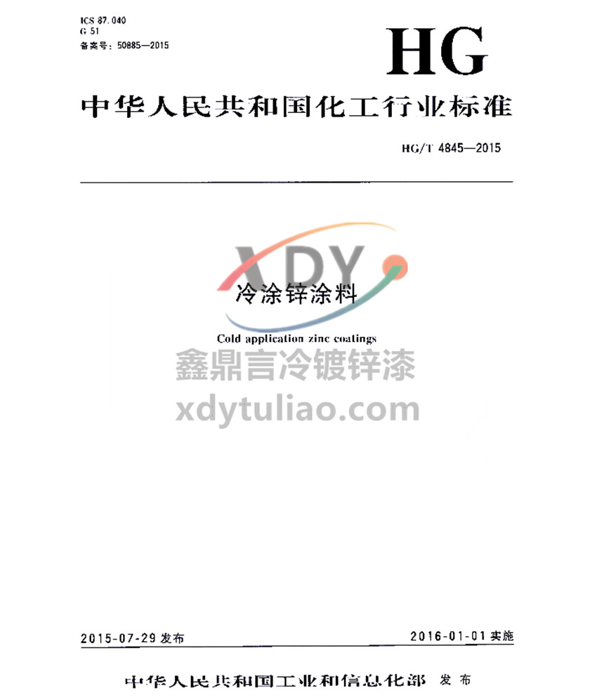 HG/T 4845-2015冷涂鋅涂料標準 備案號:50885-2015 中華人民共和國化工行業標準 HG/T 4845-2015 冷涂鋅涂料Cold application zinc coatings 2015-07-29發布 2016-01-01實施 中華人民共和國工業和信息化部發布 本標準適用于常溫施涂的高鋅含量的有機涂料。該產品是由鋅粉、有機樹脂、溶劑等組成的單組分涂料,主要用于鋼鐵底材暴