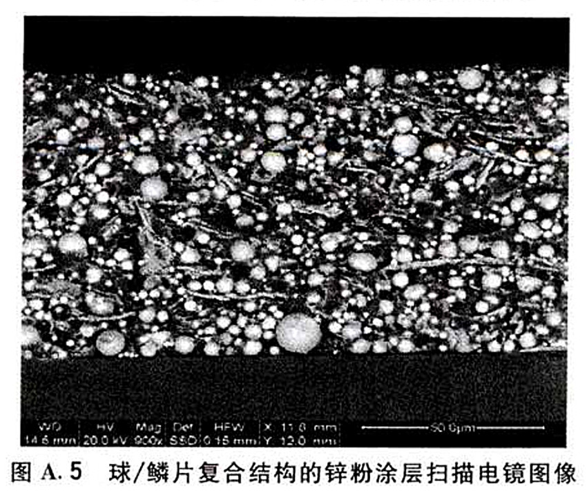 圖A.5  球/鱗片復合結構的鋅粉涂層掃描電鏡圖像